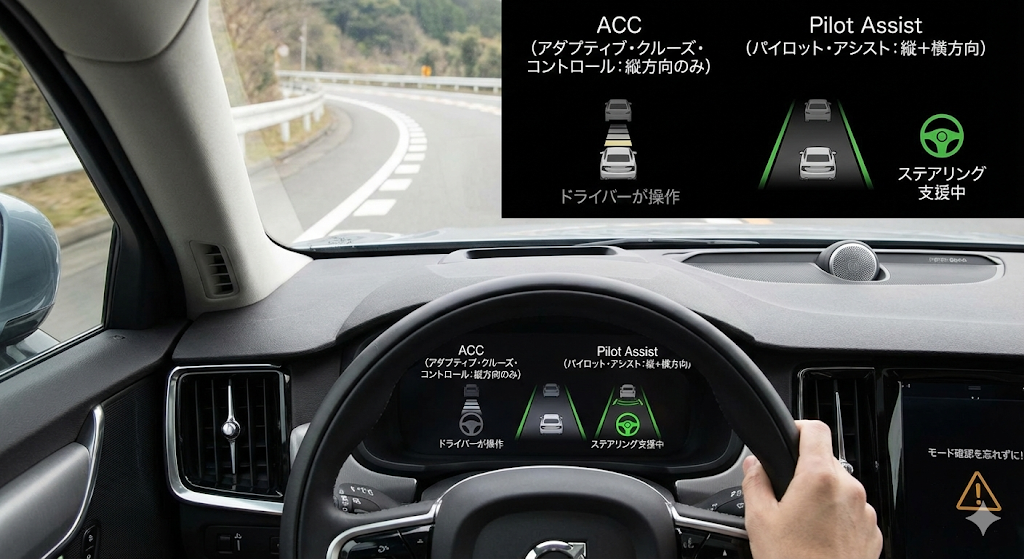 - アダプティブ・クルーズ・コントロール(ACC)は速度調整のみ、パイロット・アシストは操舵支援も含む
