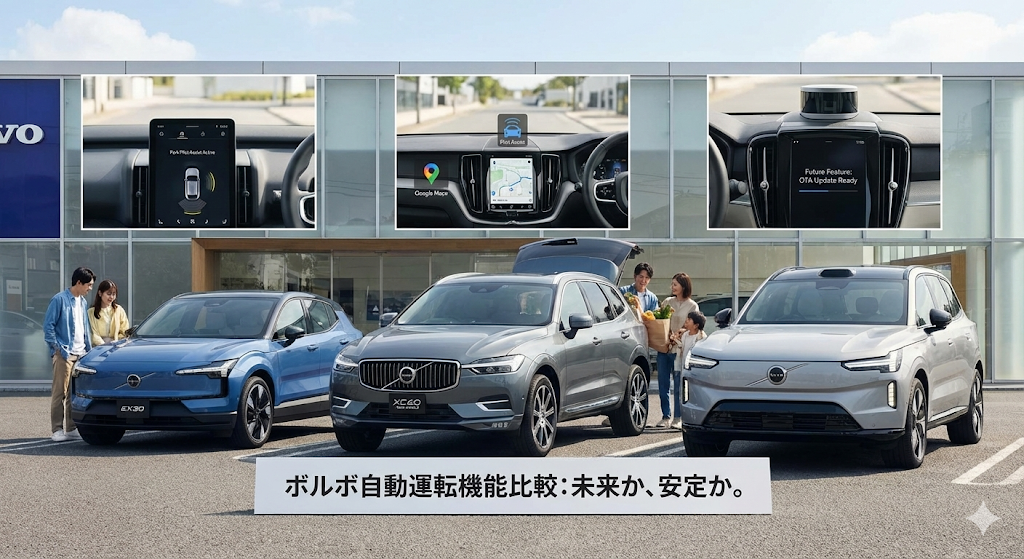 最新の電気自動車である「EX30」や「EX90」は、次世代のプラットフォームを採用しており、センサーの処理能力やソフトウェアの更新性(OTA)において優位性があります。特にEX30には「パーク・パイロット・アシスト」などの高度な駐車支援機能が搭載されており、都市部での取り回しを重視する方には魅力的です。