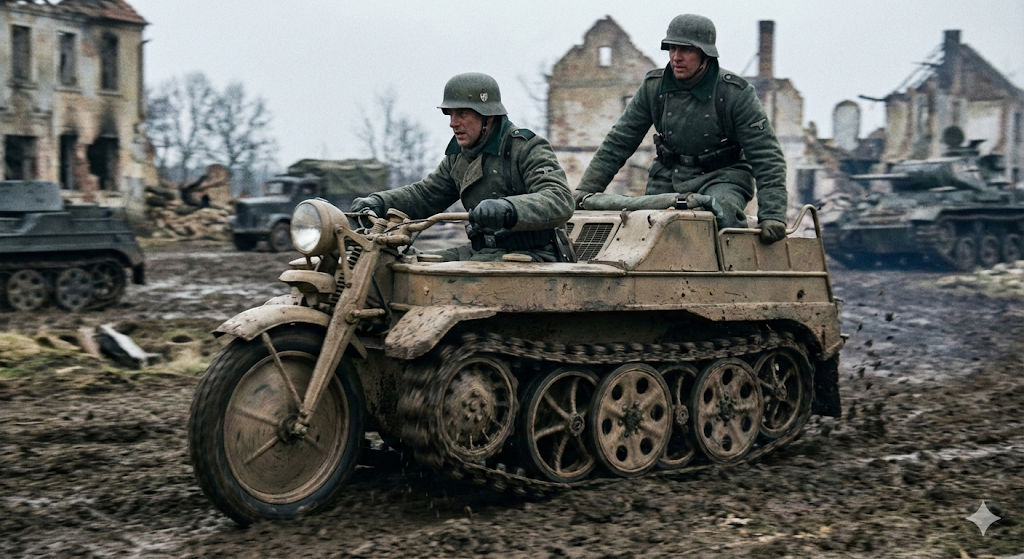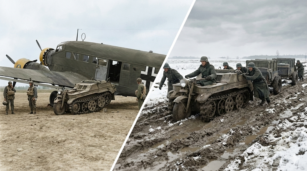 しかし、戦局の推移とともにその役割は大きく変化していきます。クレタ島以降、大規模な空挺作戦の機会が減少する一方で、東部戦線における泥濘(ラスプティツァ)や深雪といった過酷な環境下での輸送手段が深刻な課題となっていました。トラックや通常のオートバイがスタックして動けなくなる中、接地圧の低いケッテンクラートは泥や雪の上を自在に走り回ることができたのです。