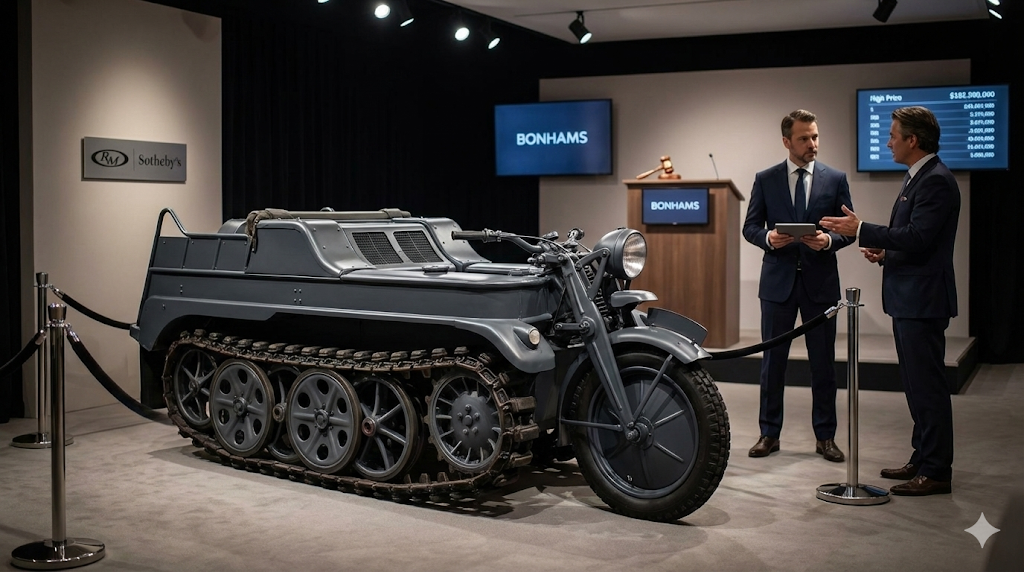 2025年現在、ケッテンクラートの実車を市場で見つけることは極めて困難になりつつあります。かつては欧米の納屋から発見された未レストアの個体が市場に出回ることもありましたが、現在流通している車両の多くは、すでに専門家の手によってフルレストアされた「完成品」です。これらは主に、ボナムズ(Bonhams)やRMサザビーズ(RM Sotheby's)、ブリング・ア・トレーラー(Bring a Trailer)といった、世界的に著名なオークションハウスや、ミリタリー車両専門の高級ディーラーを通じて取引されています。