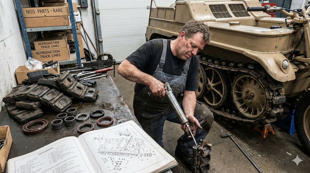晴れてオーナーとなり、仮にナンバーが取得できたとしても、維持管理の戦いは続きます。ケッテンクラートの所有者を最も悩ませるのは、やはり履帯(トラック)のメンテナンスです。この車両の履帯は、各リンク(コマ)同士をつなぐピンにニードルベアリングが封入されているという、非常に精密かつ贅沢な構造をしています。これは走行抵抗を減らしスムーズな走りを実現するための設計ですが、整備の観点からは悪夢と言えます。