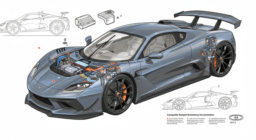 デウス・ヴァイアンの性能を支える中心的な要素が、複合構造バッテリーです。このバッテリーは、最大1,360馬力を供給可能で、電動車両としての可能性を広げています。従来のリチウムイオンバッテリーに比べ、エネルギー密度と放電性能が大幅に向上しており、瞬時に高い出力を引き出すことが可能です。