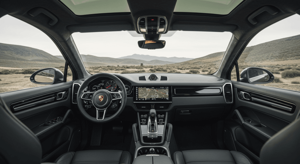 カイエン E-ハイブリッドのインテリアは、ポルシェらしい高級感と先進性が融合したデザインとなっています。最新のポルシェ コミュニケーション マネジメント(PCM)システムが搭載され、ナビゲーションやインフォテインメントの操作性がさらに向上しています。また、シートには高品質な素材が使用されており、長時間のドライブでも快適に過ごせる工夫がされています。